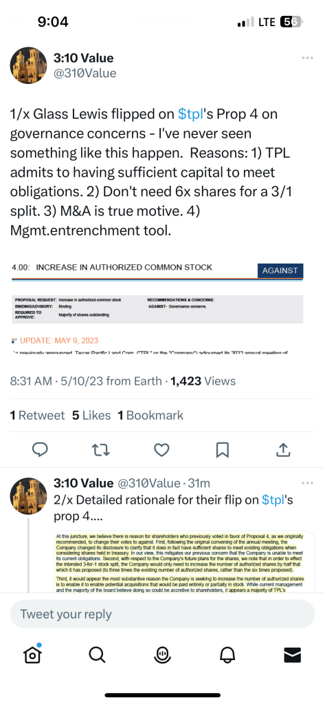 In its May 9 update of its analysis of Proposal 4, Glass Lewis explains its change of recommendation as based on its review of the documents filed in the Delaware Chancery Court litigation initiated by the Company against the “Investor Group” of the Company owning some 21% of the Company outstanding common shares, and TPL’s April 25 supplemental proxy materials. (Lion Long Term Partners is not a member of the Investor Group.)